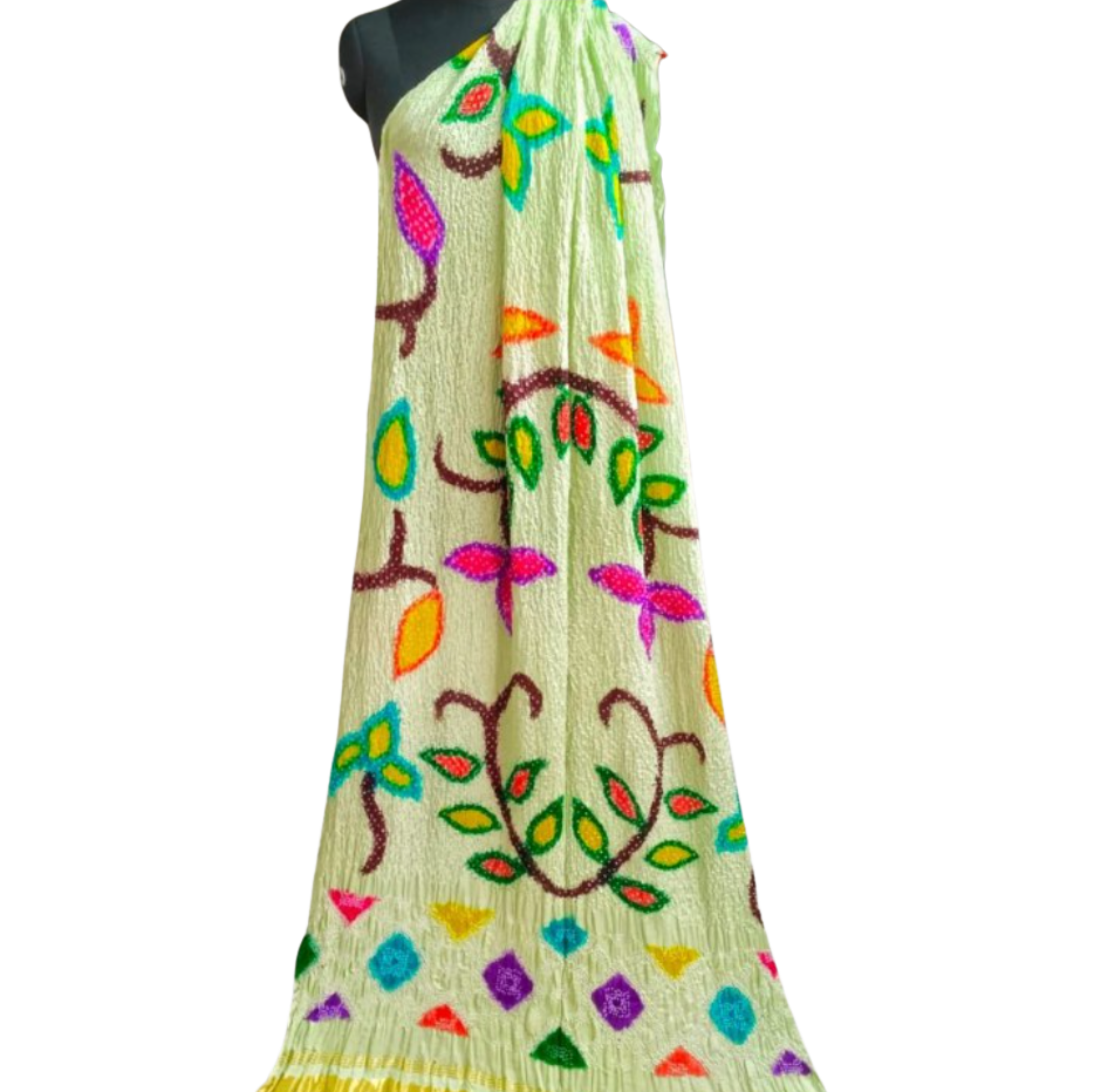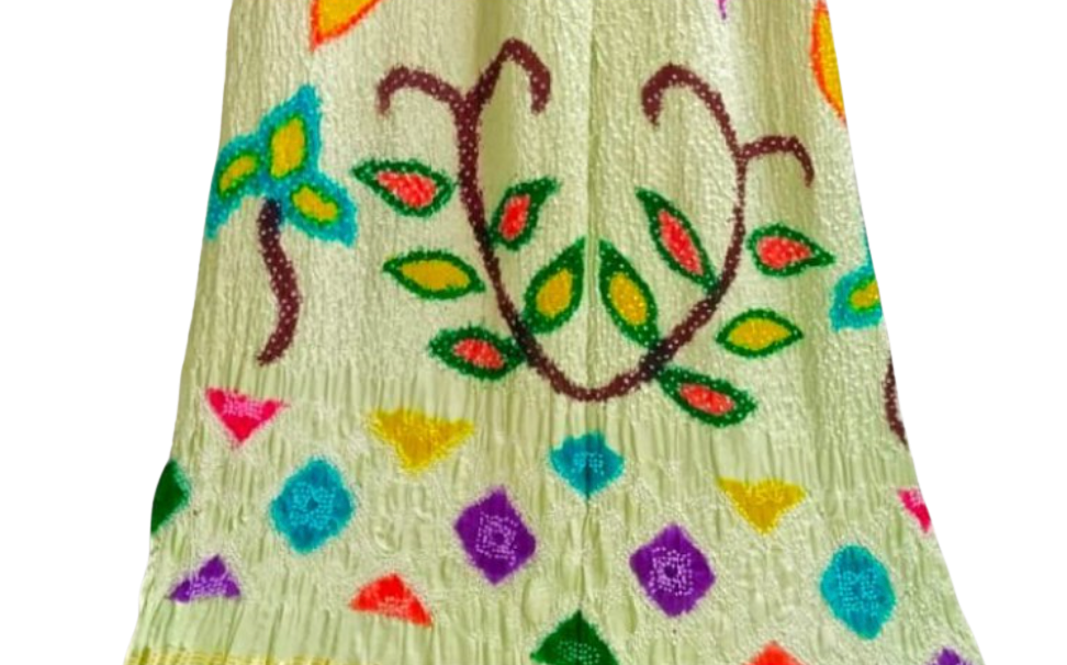 Multicolour hand painted design on a pastel green bandhani base with lagadi patta pallu & decorated with latkan.