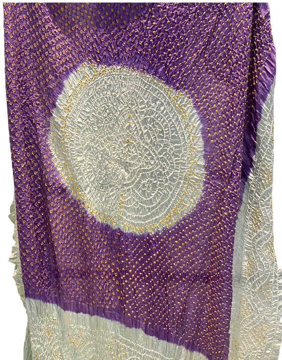 Unique combination of grey & purple shade dupatta with yellow & white bandh zari border. Finished with handmade latkans.