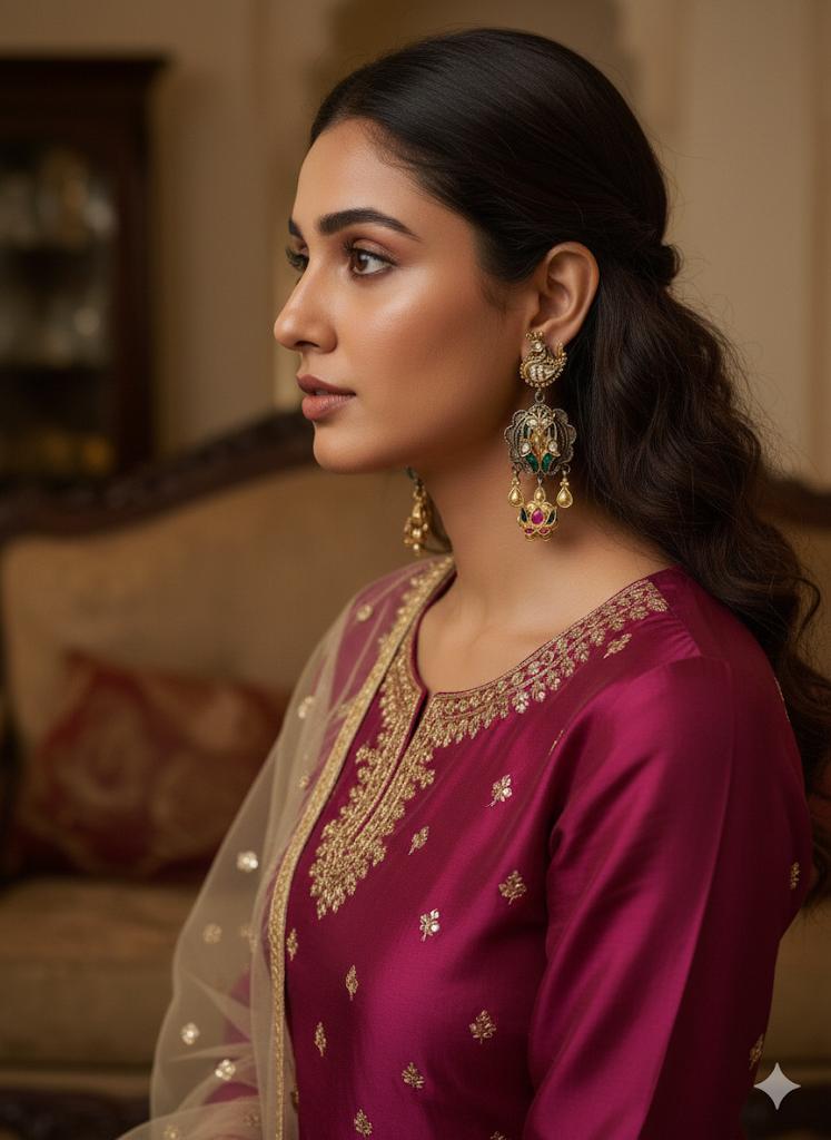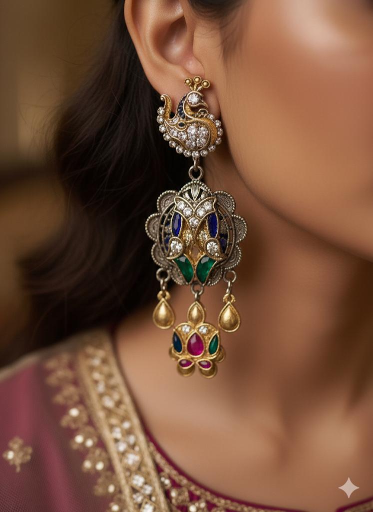 Elevate your festive wardrobe with these exquisite handcrafted silver earrings adorned with luxe Kundan stones. A blend of traditional artistry and modern charm, they add a vibrant pop to  any outfit from Navratri lehengas to destination wedding ensembles. Designed with partial gold accents and secure screw-top fittings, these earrings bring unmatched grace and comfort to every celebration.