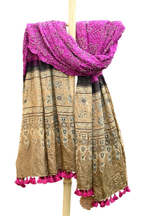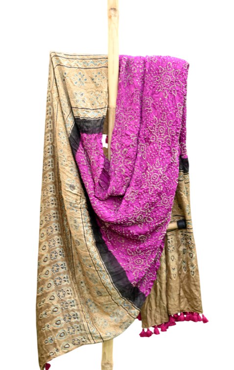 Traditional Ajrakh print border pallu complimented with heavy bandhani on gajji silk dupatta decorated with handmade latkans.