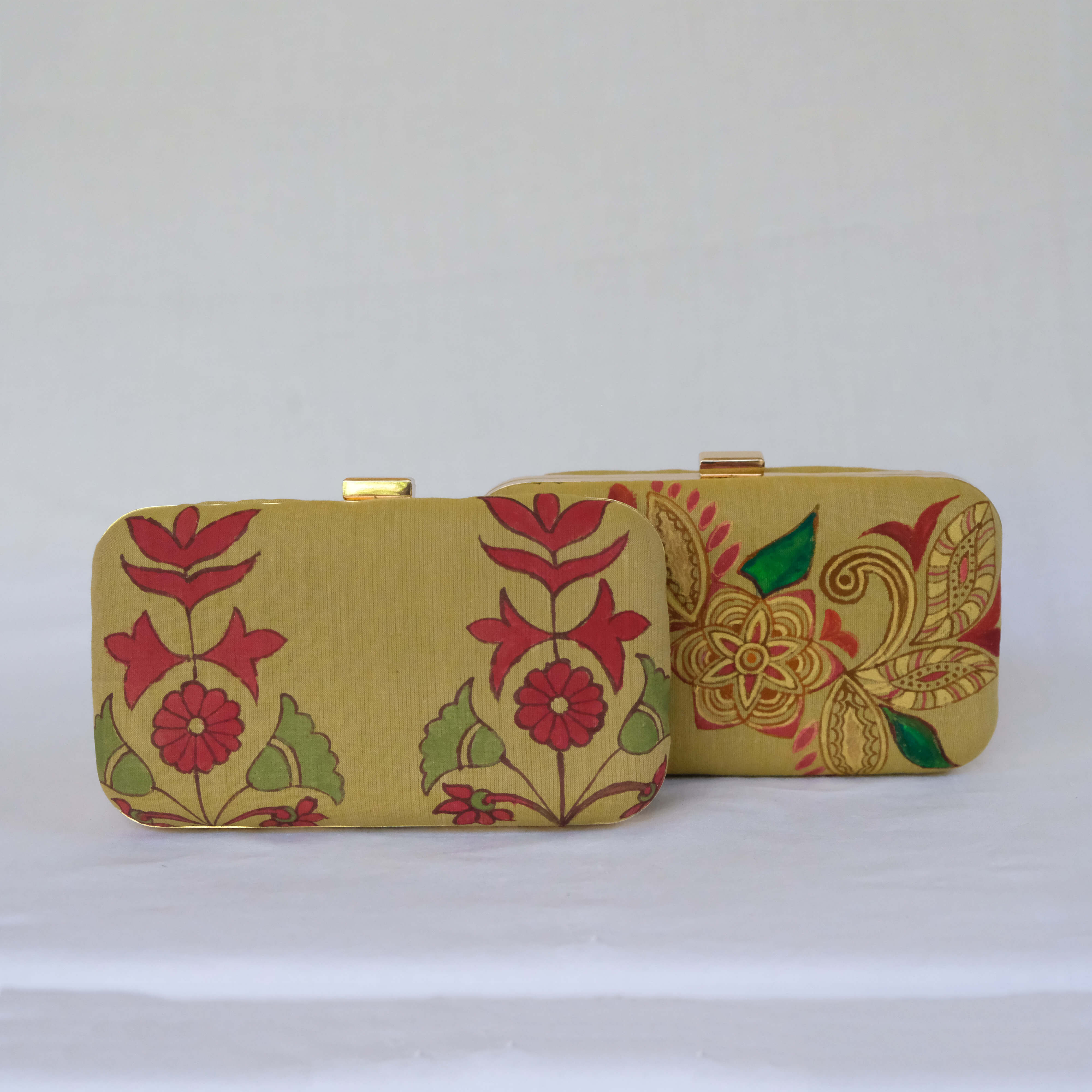 The Hand Painted Art Sling represents the pinnacle of Indian artistic tradition, where vibrant colors on handwoven fabric mark the style, symbol and elegance of various artworks of India. This exquisite clutch showcases intricate floral patterns meticulously hand-painted by skilled artisans, celebrating the rich cultural heritage and timeless beauty of traditional Indian art forms. Each piece tells a story of craftsmanship passed down through generations, featuring a lustrous golden base that serves as the perfect canvas for the vibrant reds, greens, and detailed motifs that dance across its surface.